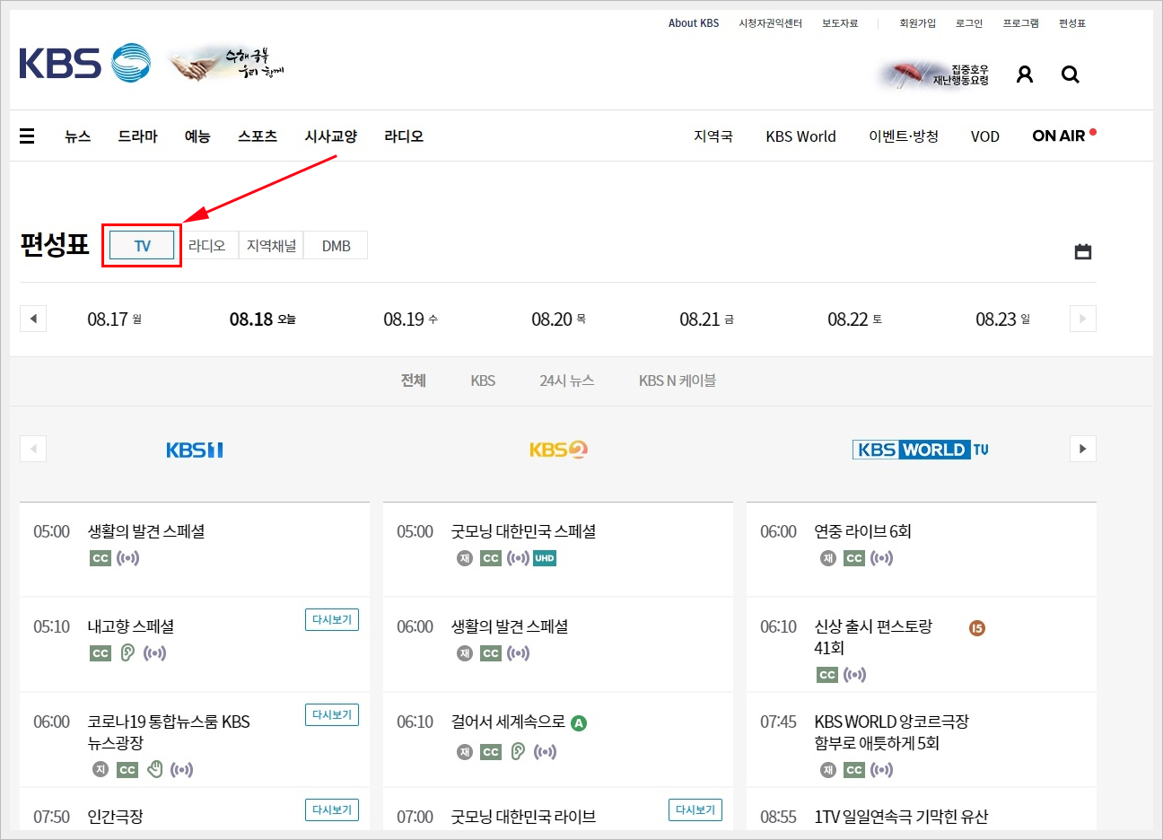 KBS 온에어 편성표를 알아두시면 무척이나 유용합니다. 실시간으로 방송시간을 잘 모를때가 있으신데요. KBS1, KBS2, 라디오, 지역채널 및 기존에 방영됐던 DMB까지 모두 실시간으로 시청이 가능합니다. 한마디로 KBS방송의 모든 스케줄이라고 보시면 됩니다. 바로가기는 아래 링크 따라가시면 됩니다.